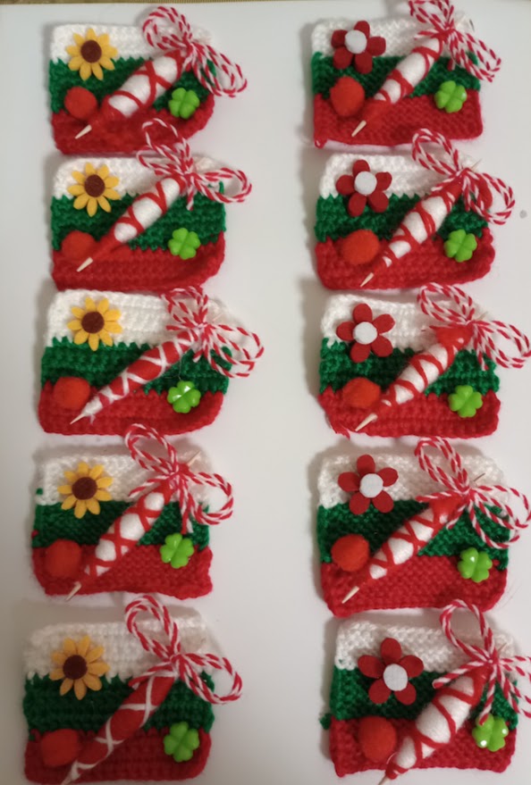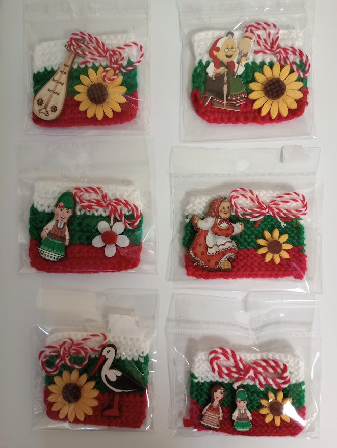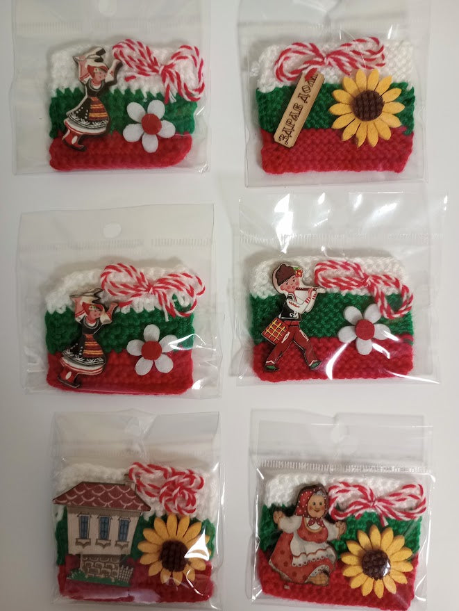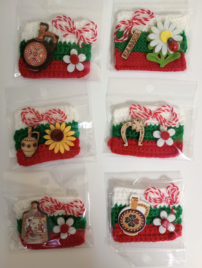 Плетено знаме с български цветове от прежда, мартеничка, украса и магнит.